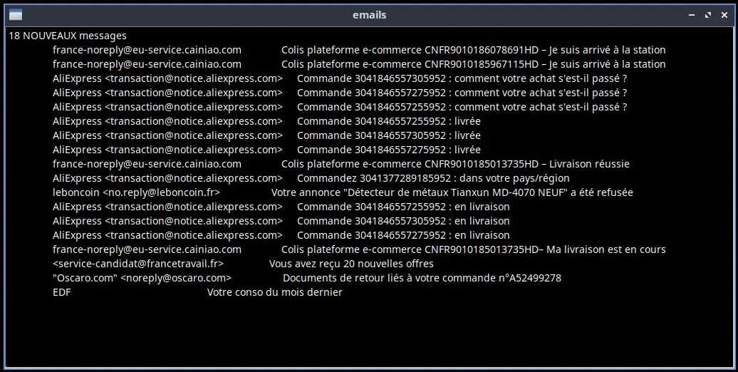 /* 5 octobre 2024 PRÉSENTATION ======================================================= Mon Smartphone est configuré pour checker les emails toutes les 10 minutes. Or j'ai besoin de plus de réactivité. Donc quand je travaille sur PC, cet exécutable 1 fois par minute se connecte au serveur POP3 en TLS et récupère les en-têtes SMTP des nouveaux messages, pour afficher uniquement les champs FROM et le SUBJECT et dire via synthèse vocale "Vous avez 3 nouveaux messages". S'il y a des nouveaux messages, j'ouvre peut-être un client email pour les voir, ou directement le site concerné.Ce programme de 26.2Ko compilé tourne à 0% CPU. La 1re version était en C console. Or une console occupe 17Mo de mémoire et le titre de la fenêtre n'était pas explicite. Par contre ce même programme dans une fenêtre FLTK occupe seulement 1.9Mo de mémoire. Développé en trois jours, c'est une réécriture plus légère de SPEECH_POP3 https://c.masta.fr/audio/speechAPI/speechPOP3.html qui: - tournait avec l'API Win32 et GTK+ sous Linux - permettait de gérer plusieurs boites - mais fonctionnait sur le port 110 cad non sécurisé (le mot de passe transite en clair par le réseau). INSTALLATION DES HEADERS DE DÉVELOPPEMENT ========================== $ sudo apt install libftlk1.3 libfltk1.3-dev Il est nécessaire de prendre 29,3 Mo dans les archives. Après cette opération, 119 Mo d'espace disque supplémentaires seront utilisés. Les NOUVEAUX paquets suivants seront installés : build-essential dpkg-dev fakeroot fltk1.3-doc fluid g++ g++-13 g++-13-x86-64-linux-gnu g++-x86-64-linux-gnu libalgorithm-diff-perl libalgorithm-diff-xs-perl libalgorithm-merge-perl libfakeroot lto-disabled-list make libfltk-cairo1.3t64 libfltk-forms1.3t64 libfltk-gl1.3t64 libfltk1.3-dev libstdc++-13-dev COMPILATION ======================================================== $ cd dossier $ g++ -Wall -s emails.cpp -o emails -lfltk -lX11 -lpthread EXEMPLE PROTOCOLE POP3 en SSL port 995 ============================= $ openssl s_client -quiet -crlf -connect pop.ionos.fr:995 depth=2 C = US, O = DigiCert Inc, OU = www.digicert.com, CN = DigiCert Global Root G2 verify return:1 depth=1 C = US, O = DigiCert Inc, OU = www.digicert.com, CN = GeoTrust TLS RSA CA G1 verify return:1 depth=0 C = FR, ST = Grand Est, L = Sarreguemines, O = IONOS SARL, CN = smtp.ionos.fr verify return:1 +OK POP server ready H mieue111 1MM03T-1sYe5L1y5Z-00IT3l USER joe55@masta.fr +OK password required for user "joe55@masta.fr" PASS xxxxxxxxx +OK mailbox "joe55@masta.fr" has 106 messages (8281006 octets) H mieue111 STAT +OK 106 8281006 LIST +OK 1 1255411 ← c'est l'email le plus ancien en bas de liste 2 654545 3 44541 ... RETR 1 Return-Path: <votre-conseiller@relation-client-edf.fr> Authentication-Results: kundenserver.de; dkim=pass header.i=votre-conseiller@relation-client-edf.fr Received: from omp.relation-client-edf.fr ([140.86.230.217]) by mx.kundenserver.de (mxeue103 [217.72.192.67]) with ESMTPS (Nemesis) id 1McJoo-1r6GOB1gaq-00kRoh for <joe55@masta.fr>; Mon, 19 Feb 2024 12:29:27 +0100 Received: by mta01-am3.am3.responsys.com id hqctpe35r74j for <joe55@masta.fr>; Mon, 19 Feb 2024 11:29:27 +0000 (envelope-from <votre-conseiller@relation-client-edf.fr>) MIME-Version: 1.0 Content-Type: text/html; charset="UTF-8" Content-Transfer-Encoding: quoted-printable Date: Mon, 19 Feb 2024 11:29:27 +0000 To: joe55@masta.fr From: =?UTF-8?B?RURG?= <votre-conseiller@relation-client-edf.fr> Reply-To: =?UTF-8?B?RURG?= <ne_pas_repondre@relation-client-edf.fr> Subject: Votre conso du mois dernier <=21DOCTYPE html> <html xmlns=3D=22http://www=2Ew3=2Eorg/1999/xhtml=22 xmlns:o=3D=22urn:schem= as-microsoft-com:office:office=22 xmlns:v=3D=22urn:schemas-microsoft-com:vm= l=22> <head> <title>EDF</title> ... TOP 1 3 ← ne donne que les en-têtes SMTP et les 3 premières ligne du contenu HTML TOP 1 0 ← ne donne que les en-têtes SMTP QUIT +OK POP server signing off à améliorer: il fait une connexion openssl pour chaque message, 1 seule serait mieux */ #include <FL/Fl.H> #include <FL/Fl_Window.H> #include <FL/Fl_Text_Display.H> #include <pthread.h> #include <stdio.h> #include <stdlib.h> #include <string.h> #include <unistd.h> #include <iconv.h> #include <time.h> Fl_Text_Display* disp; Fl_Text_Buffer* buf; /*============================================================================== Ajoute une ligne à l'interface ==============================================================================*/ void addmsg(const char* msg){ buf->append(msg); disp->insert_position(buf->length()); disp->show_insert_position(); Fl::check(); // force refresh window } /*============================================================================== Convertit une chaîne iso-8859-1 ou windows-1252 ou autre vers UTF-8 ==============================================================================*/ char* toUTF8(char* in, size_t len, char* encoding) { //iconv_t iconvDesc = iconv_open("UTF-8//TRANSLIT//IGNORE", "ISO−8859-1"); iconv_t iconvDesc = iconv_open("UTF-8//TRANSLIT//IGNORE", encoding); if (!len){ addmsg("erreur toUTF8: chaine entrée est vide\n"); return NULL;} size_t utf8len = 2*len; char* utf8 = (char*)calloc(utf8len, sizeof(char)); if (!utf8) {addmsg("erreur toUTF8: échec de Calloc()\n");return NULL;} char* utf8start = utf8; iconv(iconvDesc, &in, &len, &utf8, &utf8len); iconv_close(iconvDesc); return utf8start; } /*============================================================================== Base64 decode. Retourne un nouveau string qu'il faudra libérer ==============================================================================*/ char* decoder_base64(char *input, int size) { static const char cd64[]="|$$$}rstuvwxyz{$$$$$$$>?@ABCDEFGHIJKLMNOPQRSTUVW$$$$$$XYZ[\\]^_`abcdefghijklmnopq"; unsigned char in[4], out[4], v; int i, len; int p1 = 0, p2 = 0;//, size=strlen(input)+1; char output[size*3/4 + 1]; while (p1 < size){ for (len=0, i=0; i<4 && p1<size; i++){ v = 0; while (p1<size && v == 0){ v = 