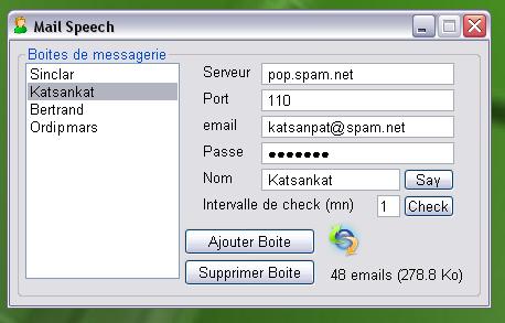 [Win32 SPEECH SDK] Connection serveur de messagerie POP3Version5 Ajouté un bouton dans l'interface de configuration pour dire le nom. La taille des messages est affichée en octets, Ko ou Mo (avant elle était affichée en octets). Autres modifications minueures. Télécharger sources + binaires Télécharger sources Linux GTK+ Version 4 Toute la partie saisie de données en console a été enlevée, car un GUI pour gérer les boites a été ajouté. Le GUI est lancé automatiquement si le fichier de stockage n'existe pas. Les deux appli (speech console et GUI) partagent la partie qui lit/écrit dans le fichier de stockage (l'objet junk). De plus l'organisation du code a changé: ajout d'un dossier bin. Compilé sur XP, pourtant le binaire tourne direct sur Win10 (les joies du code natif). La dll Sur Windows XP, une très petite dll sert d'interface avec le Speech API, dont il a fallu ressortir VC6 forcé pour la compiler. Elle n'expose qu'une seule fonction: say(). Le code de cette dll: