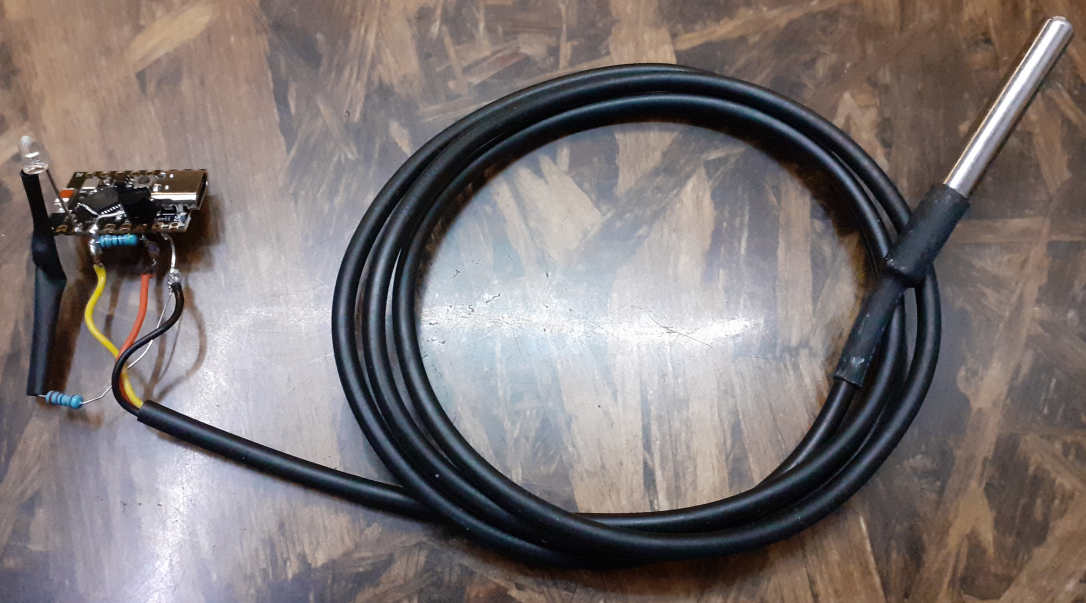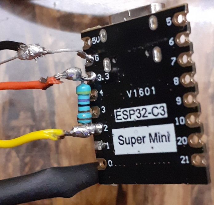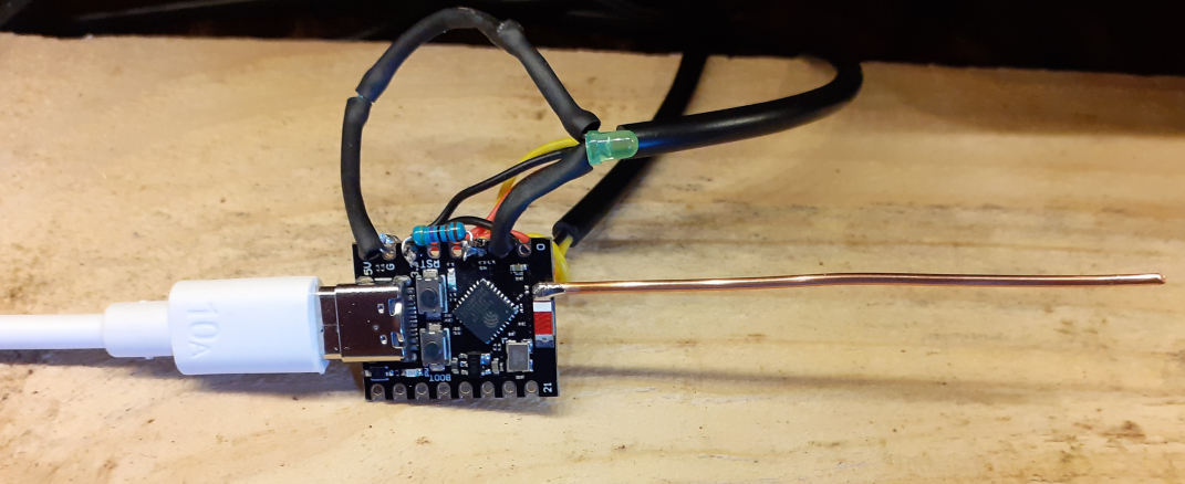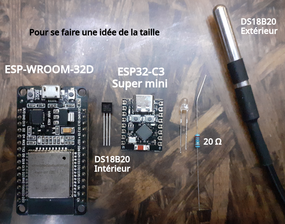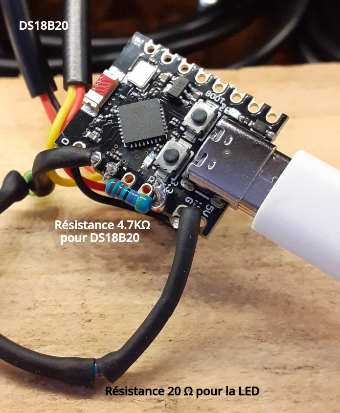 Ensuite j'ai soudé un deuxième ESP32-C3, cette fois avec un DS18B20 sans câble pour le capteur intérieur. Sans antenne. Avec une LED blanche. Le reste est identique.