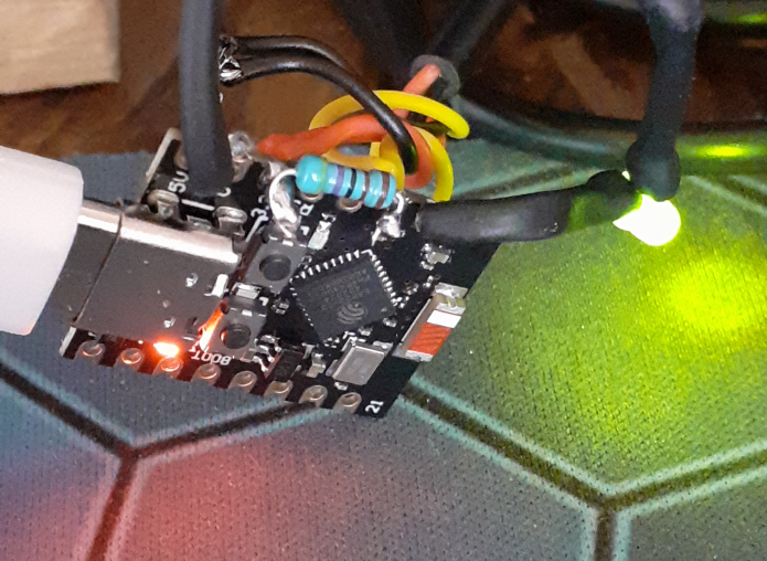 Au lieu d'utiliser la LED bleue interne de l'ESP, il y a une LED externe (avec une résistance) car l'ESP est caché dans un cadre mural et on ne voir pas sa LED bleue. Selon sa fréquence de clignotement de la LED déportée, elle indique quand il tente de se connecter au Wifi et quand il envoie les données.